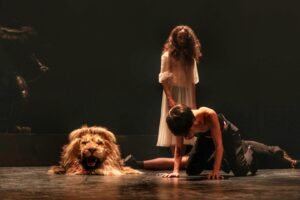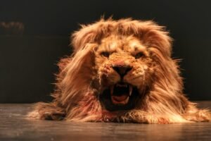 על הבמה ניצב לאורך ההצגה סמל מרכזי. אריה עומד על כן. ברגע הראשון קשה שלא לחשוב על הסיסמה עם כלביא, ועל האופן שבו דימוי האריה משמש להצדקת כוח, עוצמה ומלחמה. אך ככל שההצגה מתקדמת, האריה מתפרק.