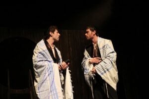 ההצגה נפתחת בעולם ישיבתי סגור, המוגדר על ידי סדר יום קבוע, היררכיה ברורה ופיקוח קהילתי מתמיד. הלימוד בחברותא, הישיבה תחת טלית אחת והקרבה הפיזית המותרת לכאורה בתוך המרחב הדתי הם הקרקע שעליה מתפתח קשר אינטימי. הקירבה הזו אינה רק פיזית אלא סימן סמוי של קשר רגשי עמוק. שני הבחורים אינם מבולבלים באשר לרגשיהם, אלא באשר ליכולתם לממשו.
