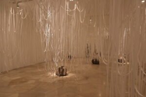 אונישי יסואקי אמן יפני שעבר מפיסול וצילום לעבודה באינסטלציות מנייר ואבן. אונישי, שזו לו תערוכה רביעית בישראל ויש לו קשר עם עם האוצרת, יצר עבודה חדשה ויפהפיה עבור תערוכה זאת.פסי נייר לבנים ממלאים את החדר, כשהם יורדים בתנועה מעגלית עד לרצפה, עליה מונחות אבני בזלת. אונישי מסביר את שיטת העבודה החדשה שלו דרך מושג הריקות. הוא ממלא חלל ריק בשני חומרים מנוגדים. נייר עדין מול אבני בזלת עתיקות. כוח הכובד מול קלילות.