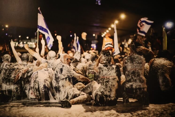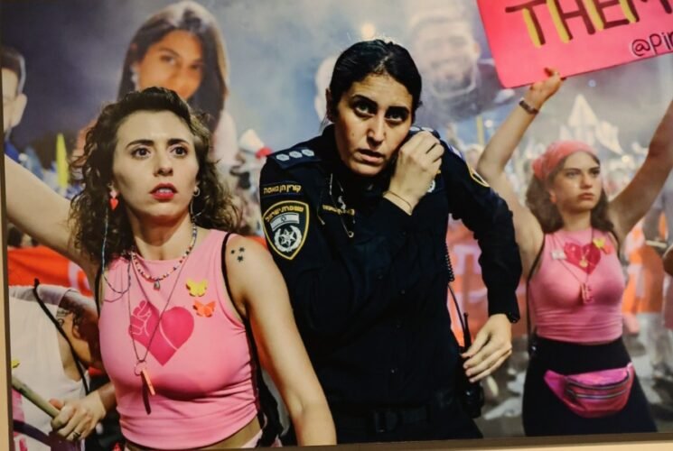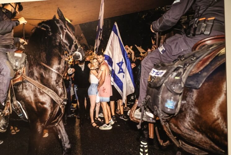 אחת מנקודות הכובד של התערוכה היא הזירה האזרחית. תומר אפלבאום מהארץ מציג הפגנה שבה חרדים שורפים צווי גיוס, בעוד צילום נוסף של מוטי מילרוד, גם הוא מהארץ, מתעד לוויה של חייל שנפל. שני קווים מקבילים, שתי מציאויות שמתקיימות באותו מרחב. הצילום של זוג שנלכד בין שוטרים וסוסים בעקבות רצח שישה ישראלים מוסיף רובד של תסיסה מתעצמת.