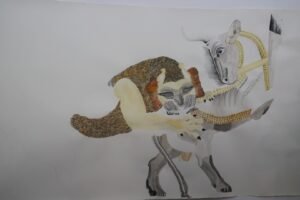 אלהם רוקני מציגה את “קומאלאק” (2024), עבודה בצבע שמן ועלי זהב וכסף על נייר, המבוססת על מסורות ניחוש עתיקות. העבודה משלבת בין מיתולוגיה לבין פרשנות עכשווית.